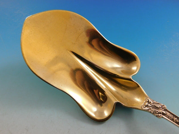 Stunning sterling silver Pastry Server measuring 10 3/4" in the pattern Olympian by Tiffany and Co. The handle of this piece features the third motif in this pattern, which is Paris, the son of Priam, presenting to Venus the golden apple. This piece features an all sterling gold-washed spade shaped serving area. It is monogrammed (see photo) and is in excellent condition.