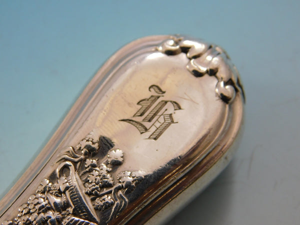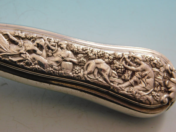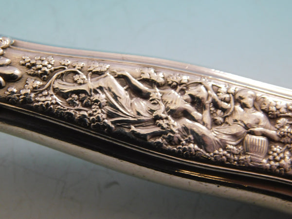 Stunning sterling silver Pastry Server measuring 10 3/4" in the pattern Olympian by Tiffany and Co. The handle of this piece features the twelfth motif in this pattern, which is Bacchus and on the reverse is amphora, thyrsus, pipes, etc. This piece has a hollow handle and features an all sterling spade serving area. It is monogrammed on the reverse (see photo) and is in excellent condition.