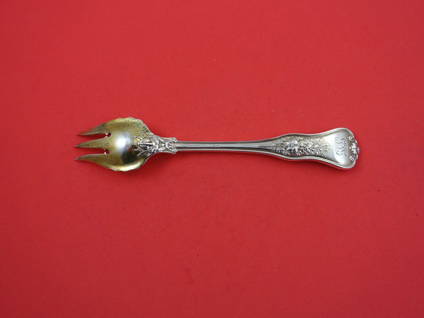 Sterling silver Salad Fork, 3-tine 2-hole, gold washed and ruffled 6 5/8" in the pattern Olympian By Tiffany Co.. It is monogrammed (monos vary) and is in excellent condition.