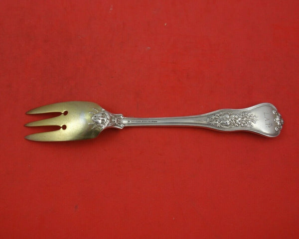 Sterling silver Salad Fork Gold Washed 3-Tine 2-Hole 6 3/4" in the pattern Olympian by Tiffany and Co. It is monogrammed on the reverse (monos vary) and is in excellent condition.