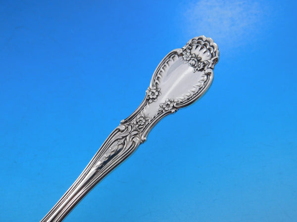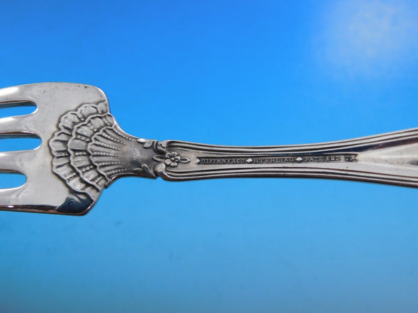 The pattern Richelieu by Tiffany Co. was patented in 1892. It is assumed this pattern is named after Louis-Francois-Armond de Vignerot du Plessis, who invented mayonnaise and the sauce Richelieu is named after. The pattern features C-scrolls bordering the front and back, with an inner shell border. Featuring flowers on the handle with a shell at the tip.
