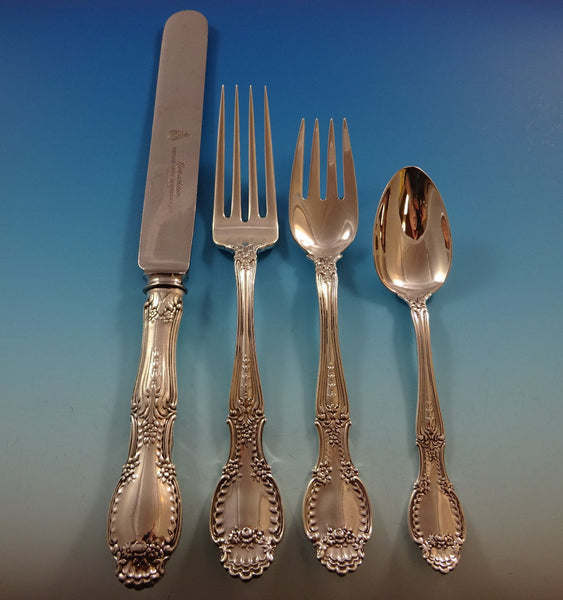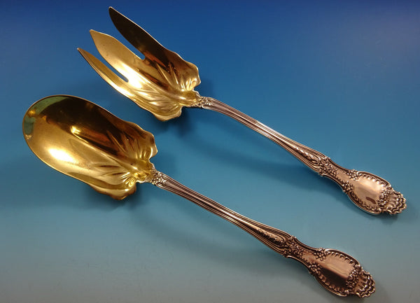 RICHELIEU BY TIFFANY CO. sterling silver Flatware set -81 Pieces IN LARGE VINTAGE CHEST. This set includes:6 DINNER SIZE KNIVES, 10" 6 DINNER SIZE FORKS, 7 1/2" 6 LUNCHEON KNIVES, 9" 6 LUNCHEON FORKS, 6 3/4" 6 TEASPOONS, 5 7/8" 6 PLACE SOUP SPOONS, 7" 6 FLAT HANDLE BUTTER SPREADERS, 5 7/8" 6 SERVING SPOONS, 8 1/2" 1 COLD MEAT FORK, PIERCED, 9" 1 SAUCE LADLE, 7" 1 LONG SALAD SET, GOLD-WASHED, 10" 1 BAKED POTATO FORK, 6 3/4" 12 FISH FORKS, ALL-STERLING, 7" 12 FISH KNIVES, HOLLOW HANDLE, ALL-STERLING, 7 5/8" 1 LETTUCE FORK, 8 3/4" 1 MUSTARD LADLE, 4 1/2" 1 SPAGHETTI SPOON, 8 1/4" 1 STUFFING SPOON W/BUTTON, 11" Includes LARGE VINTAGE (not Tiffany) storage chest - chest as-is vintage condition.