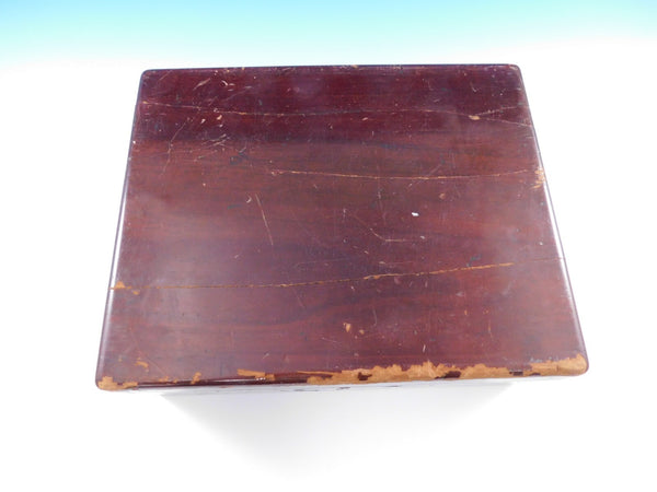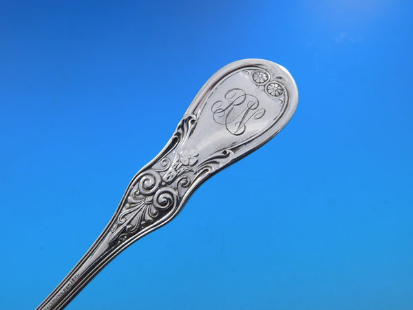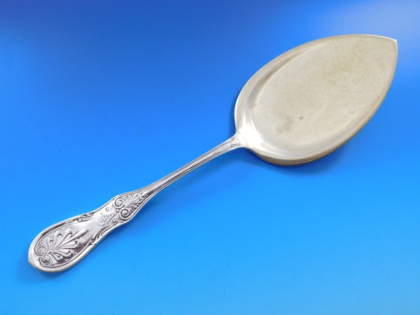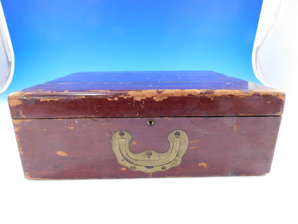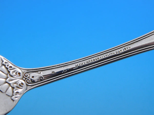 Includes fitted Tiffany vintage storage chest (some wear to chest, as shown, key no longer present). The handles of the chest are quite special in that they are "fitted" inside the wood, which was one of Tiffany's signature chest features at that time. (The two serving pieces do not fit inside slots in the chest.) Excellent condition, all with "RN" monogram on the reverse (except the pie server, which was likely added later and has a different monogram). This set will be lightly professionally polished and sealed in individual plastic sleeves prior to