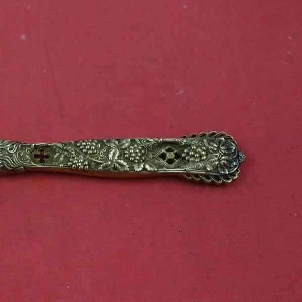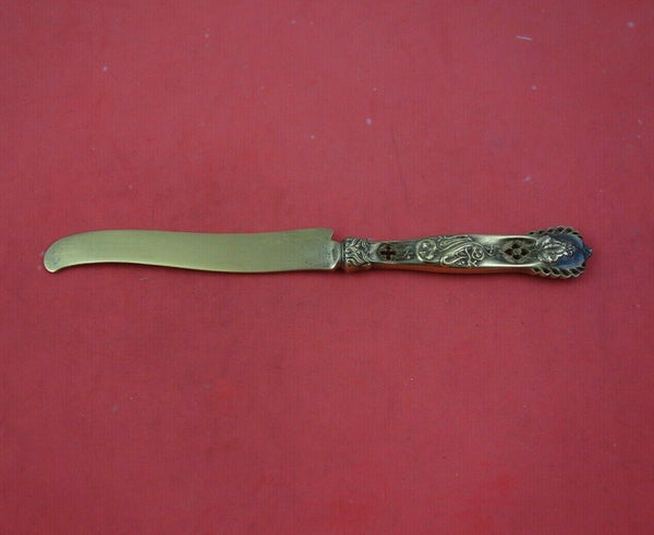 Sterling silver all sterling Dessert Knife Vermeil (completely gold washed) 7 1/4" in the Searles Custom Pattern by Tiffany and Co. This piece has a paddle shaped handle decorated with a Gothic trellis with vine and leaves and a bunch of grapes. It is not monogrammed and is in excellent condition. Exceptional!