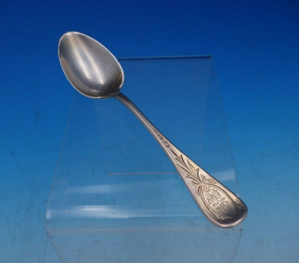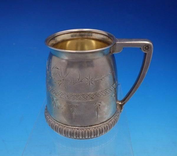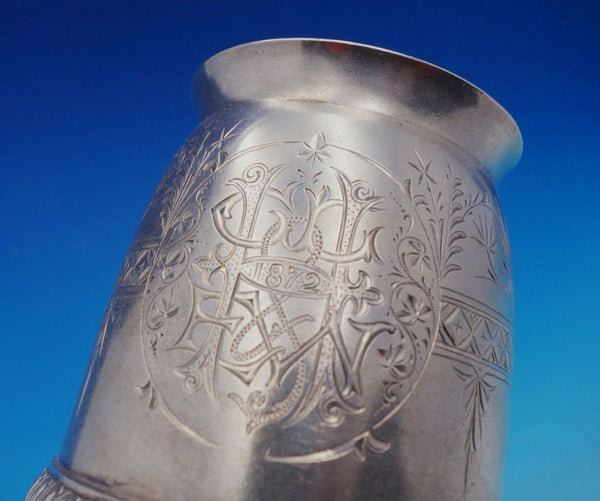 Amazing Tiffany and Co sterling silver child's 8-piece set dated 1872 in massive presentation box with blue satin lining (measures 17 1/2" x 16 1/4" x 6"). This set bears early Union Square hallmarks and includes: