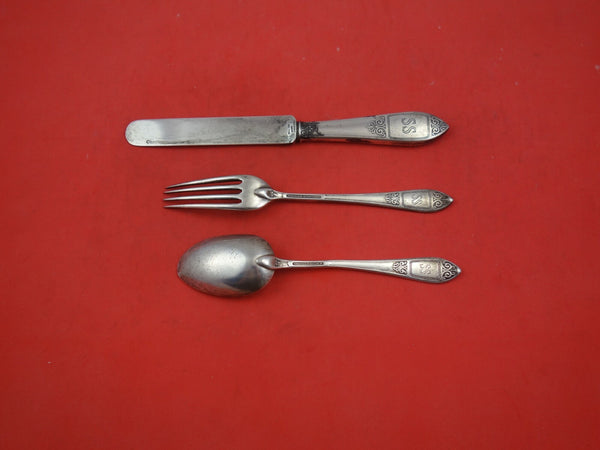 Sterling Silver Junior Set, 3-pieces, knife with rooster 7 1/4", fork with hawk 6 1/4" and spoon with owl 5 1/4". It is monogrammed (monos vary) and is in excellent condition.