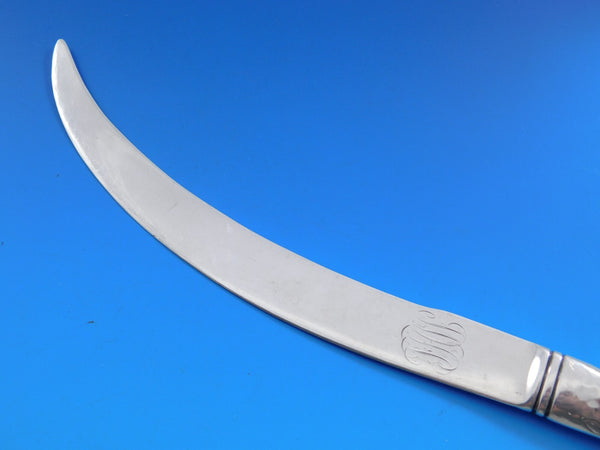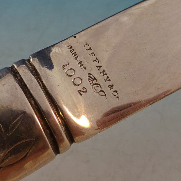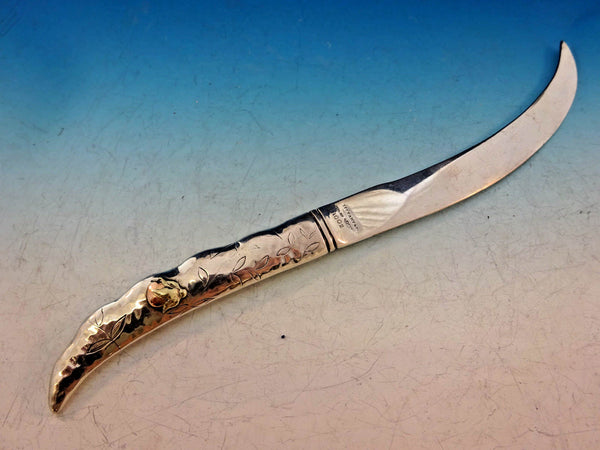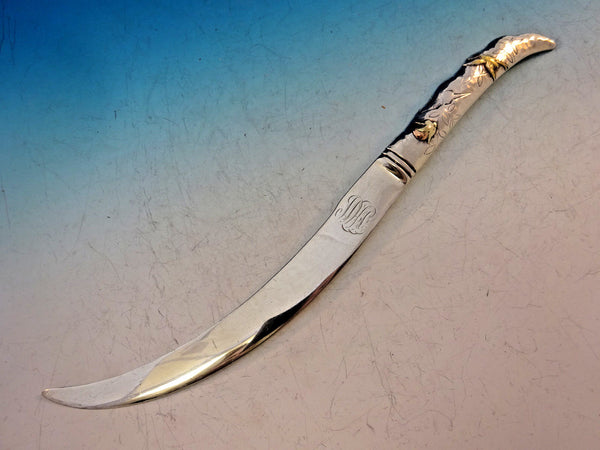 Wonderful George Shiebler sterling silver hollow handle all-sterling Paper Knife with applied mixed metal elements including a gold bird in flight and two copper/gold fruit, also with chased leaves and geometric design, measures 10 1/2”, c1880. Made by Shiebler, with retail marks for Tiffany Co. Monogrammed on the blade, very good condition with some minor nicks in the blade.