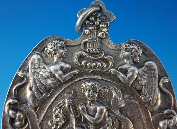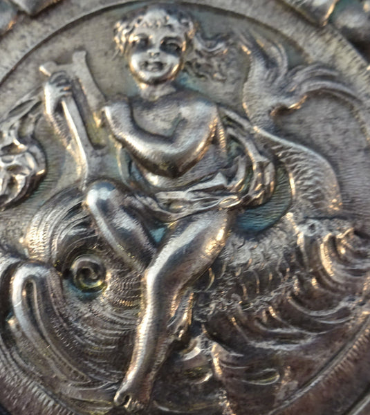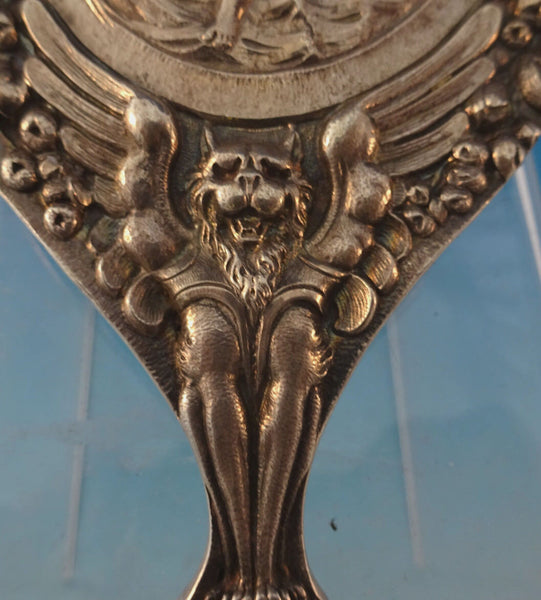 Silver Large Bonbonniere Serving Spoon with cast handle with central Cherub riding a dolphin with mythological creatures - winged lion, snakes, and a loop at the top. Marked #620, measures 11 1/2", and weighs an impressive 5.48 troy ounces. The bowl is monogrammed (please see photo) and lightly gold washed. Hand engraved on the reverse. Outstanding detail! A work of art.