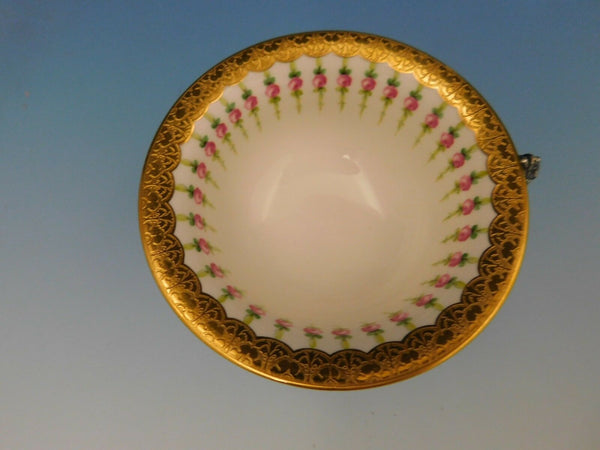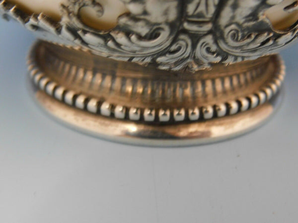 Sterling Silver BOUILLON CUP WITH CHERUBS AND LINER MADE FOR TIFFANY CUP 3 1/2" X 2" , LINER 4" WITH GOLD BORDER AND HAND PAINTED FLOWERS in the pattern TIFFANY CO. It is NOT monogrammed and is in excellent condition.