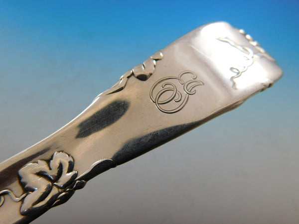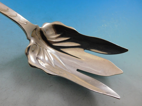 Stunning sterling silver Salad Serving Fork measuring 10" in the pattern Vine by Tiffany and Co. Vine is a muilti-motif pattern circa 1872 and has become very scarce on the market. This server features a grape motif on the handle that leads to the fluted serving area. It is monogrammed (see photo) and is in excellent condition.