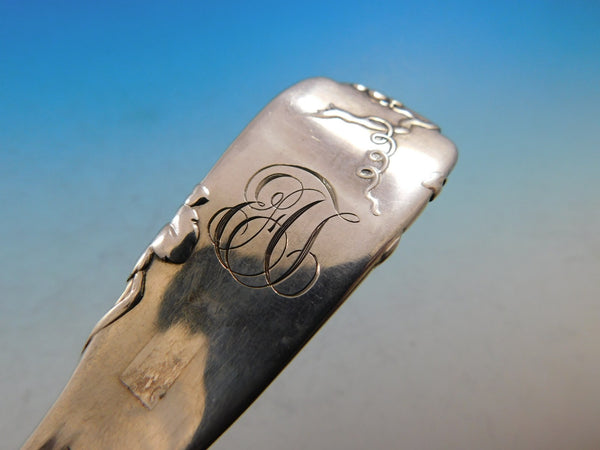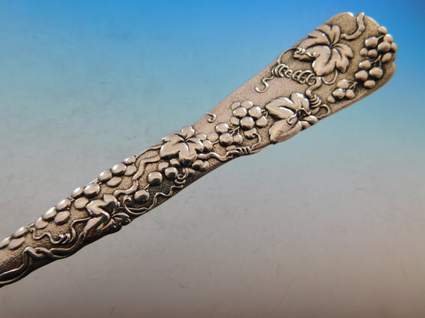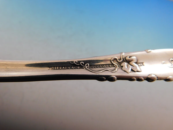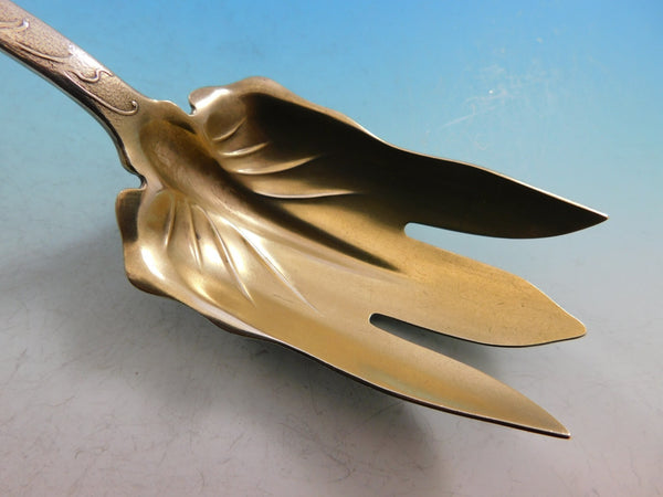 Stunning sterling silver Salad Serving Fork measuring 10" in the pattern Vine by Tiffany and Co. Vine is a muilti-motif pattern circa 1872 and has become very scarce on the market. This server features a grape motif on the handle that leads to the beautifully gold-washed fluted serving area. It is monogrammed (see photo) and is in excellent condition.