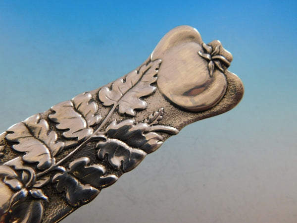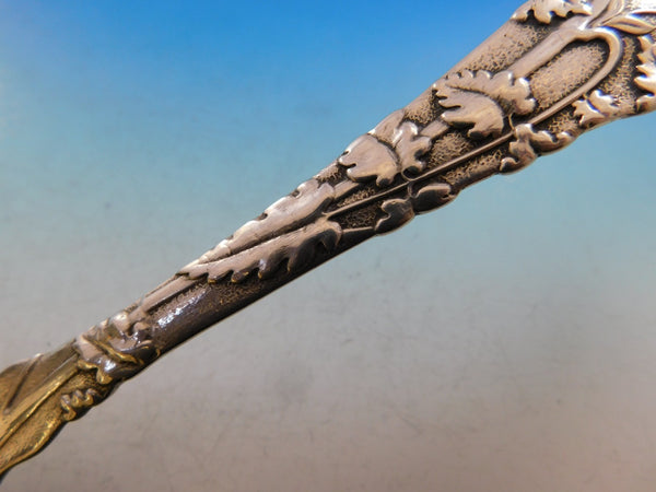 Beautiful sterling silver Soup Ladle measuring 11" in the pattern Vine by Tiffany and Co. Vine is a multi-motif pattern circa 1872 and has become very scarce on the market. This server features a tomato motif on the handle that leads to the beautifully gold-washed swirl style serving bowl. It is monogrammed (see photo) and is in excellent condition.