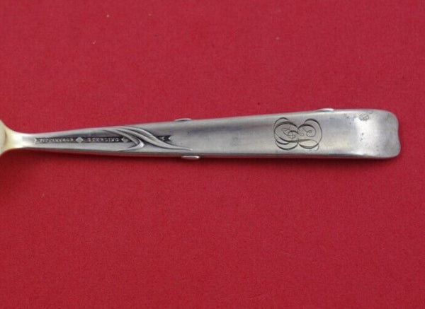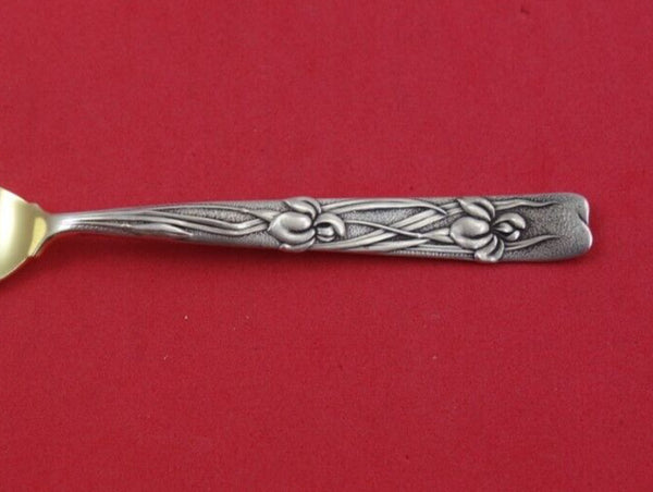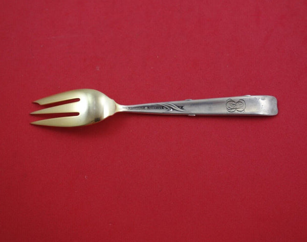 Exceedingly rare Sterling silver Pastry Fork 3-tine gold-washed with Iris motif handle 5" in the pattern Vine by Tiffany and Co. It is monogrammed on the reverse (monos vary) and is in excellent vintage condition.
