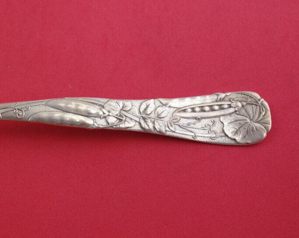 silver Pea Spoon with pea pod motif on the handle and pierced pea pod vines in