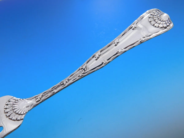 Designed by Charles Grosjean (1841-1888). Grosjean worked in his family's firm which produced high end silverware to prominent New York City retailers, including Tiffany. Upon his father's death, Grosjean left his family firm to become superintendent of Tiffany's silver factory in 1868. He had great background in silver and was an artist and was referred to as "one of the best living decorators of silver". He was a teacher in the Tiffany School and designed a few full lines of sterling patterns for Tiffany in his short time with the company before his unfortunate and sudden death. His patterns Chrysanthemum (formally Indian Chrysanthemum) and English King are some of the most famous of his designs, and of Tiffany in general.