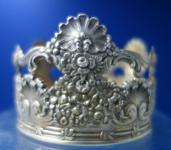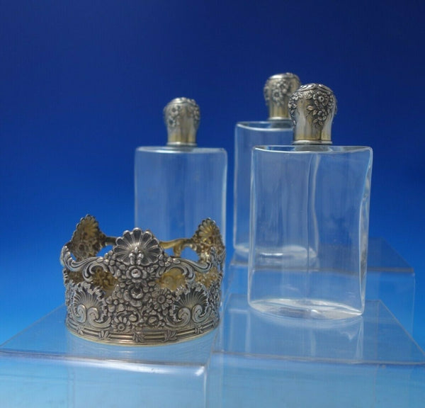 Exceptional Wave Edge by Tiffany and Co sterling silver stand with three glass bottles with sterling tops. This stand is marked #14560/3454 with "T" mark, circa 1900. This piece measures 5 3/4" tall x 3 1/4". It is not monogrammed and is in good vintage condition. Remarkable!