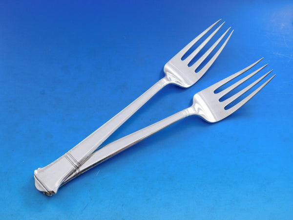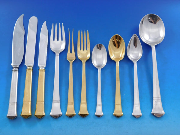 12 Dinner Size Knives with blunt stainless blades, 10 1/8"12 Dinner Size Forks, 7 3/4"12 Regular Luncheon Forks, 7"12 Salad Forks, 6 3/4"12 Teaspoons, 6"12 Flat Handle Butter Spreaders, 6"12 Cocktail Forks, 6"12 Demitasse Spoons, 4 1/4"12 Gumbo Soup Spoons, 7 1/2"12 Place Soup Spoons, 7"12 Iced Tea Spoons, 7 1/2"12 Bouillon Soup Spoons, 5 3/8"12 Steak Knives w/stainless blades, 9"12 Fish Knives w/stainless blades, 8"12 Fish Forks, all-sterling, 6 3/4"12 Grapefruit Spoons, 5 7/8"12 Coffee Spoons, 5 1/8"1 Gravy Ladle, 7 7/8"2 Serving Spoons, 8 5/8"2 Cold Meat Forks, 8 3/4"1 Pickle Fork, 2-tine, 5 3/4"2 Vegetable Serving Spoons, 9 1/4"1 Fish Serving Fork, 9 1/8"1 Sugar Tong, 4 1/4"Plus the following vermeil pieces (gold over sterling):