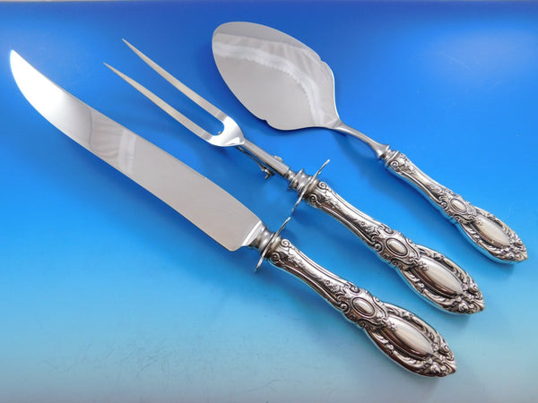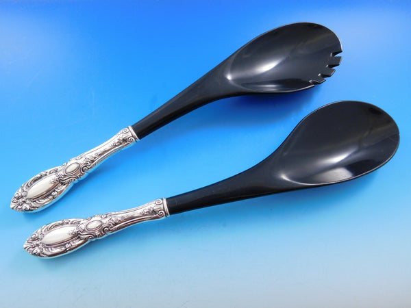 Superb monumental King Richard by Towle Sterling Silver Flatware set - 179 pieces. This set includes:12 Dinner Size Knives, French blades, 9 3/4"12 Dinner Size Forks, 7 7/8"12 Regular Knives, 8 7/8"12 Regular Forks, 7 3/8"12 Salad Forks, 6 3/8"12 Teaspoons, 6"12 Cream Soup Spoons, 6 1/8"12 Place Soup Spoons, 7 1/8"12 Hollow Handle Butter Spreaders, all-sterling, 5 3/4"12 Cocktail/Oyster Forks, 5 7/8"12 Iced Tea Spoons, 8 1/4"12 Demitasse Spoons, 4 1/2"12 Coffee Spoons, 5 3/4"1 Gravy Ladle, 7 1/8"2 Serving Spoons, 8 1/2"2 Pierced Serving Spoons, 8 1/2"2 Cold Meat Forks w/bars, 8"1 Sugar Spoon, 5 7/8"1 Hollow Handle Master Butter, 6 1/2"1 Pickle Fork, 2-tine, 6 1/4"1 Lemon Fork, 5 1/8"1 Tomato Server, pierced, 8"1 Salad Set w/black nylon implements, 11 3/4"1 Sauce Ladle, 5 7/8"1 Nut Spoon, pierced, 5"1 Jelly Server, 6 3/4"1 Roast Carving Set, 2-pc, 13 1/2" 11 1/8"1 Olive Spoon, not pierced, 6 1/8"1 Cheese Server w/stainless blade, 6 1/4"1 Pastry Server w/stainless blade, 10"1 Berry Spoon, all-sterling, 8 1/4"
