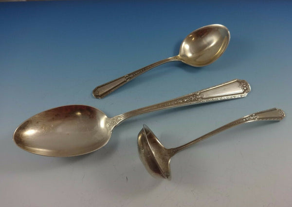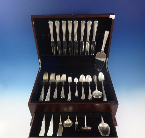 LOUIS XIV BY TOWLE DINNER SIZE sterling silver Flatware set, 78 pieces. This set includes:8 Dinner Size Knives, 9 1/2" 8 Dinner Size Forks, 7 7/8" 8 Salad Forks, 6 1/4" 8 Teaspoons, 5 7/8" 8 Cream Soup Spoons, 6 1/4" 8 Flat Handle Butter Spreaders, 5 7/8" 8 Cocktail Forks, 5 1/2" 8 Iced Tea Spoons, 7 7/8" 8 Demitasse Spoons, 4 1/4" 1 Serving Spoon, 8 1/8" 1 Sugar Spoon, 5 5/8" 1 Flat Handle Master Butter, 6 7/8" 1 Lemon Fork, 5 3/8" 1 Cake Server w/stainless blade, 10 1/4" 1 Sauce Ladle, 5 3/4" Storage chest is not included.