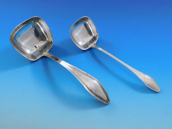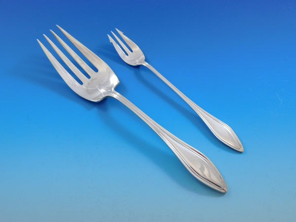 8 Knives, 9" 8 Forks, 7 3/8" 8 Dessert Forks, 7" 8 Salad Forks, 6 1/4" 8 Teaspoons, 5 7/8" 8 Place Soup Spoons, 7 1/2" 8 Flat Handle Butter Spreaders, 6" 8 Iced Tea Spoons, 8 1/8" 8 Bouillon Soup Spoons, 5 1/4" 8 Demitasse Spoons, 4" 1 Gravy Ladle, 6 1/4" 1 Serving Spoon, 8 1/4" 1 Cold Meat Fork, 8" 1 Sugar Spoon, 5 7/8" 1 Flat Handle Master Butter, 7 3/8" 1 Pickle Fork, 3-tine, 6 1/4" 1 Cake Server w/plated blade, 10 1/2" 1 Sauce Ladle, 5 3/4" 1 Jelly Server, 6 3/4" 1 Steak Carving Set, 2-pc, 9 3/4" 8 1/2"