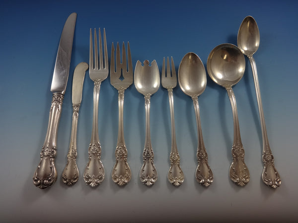OLD MASTER BY TOWLE sterling silver flatware set, 82 pieces. This set includes:8 Knives, 8 7/8" 8 Forks, 7 1/4" 8 Salad Forks, 6 3/8" 8 Teaspoons, 6" 8 Cream Soup Spoons, 6 1/4" 8 Flat Handle Butter Spreaders, 5 3/4" 8 Cocktail Forks, 5 3/4" 8 Iced Tea Spoons, 7 7/8" 8 Ice Cream Forks, 5 1/2" 1 Gravy Ladle, 6 3/4" 1 Serving Spoon, 8 1/2" 1 Pierced Serving Spoon, 8 1/2" 1 Hollow Handle Master Butter Knife, 6 3/4" 1 Pickle Fork, 5 3/4" 1 Lemon Fork, 5 1/4" 1 Pie Server w/stainless blade, 10 3/8" 1 Nut Spoon, 5 1/2" 1 Jelly Server, 6 1/2" 1 Sugar Tong, 4" Includes bonus brand new storage chest - styles vary.