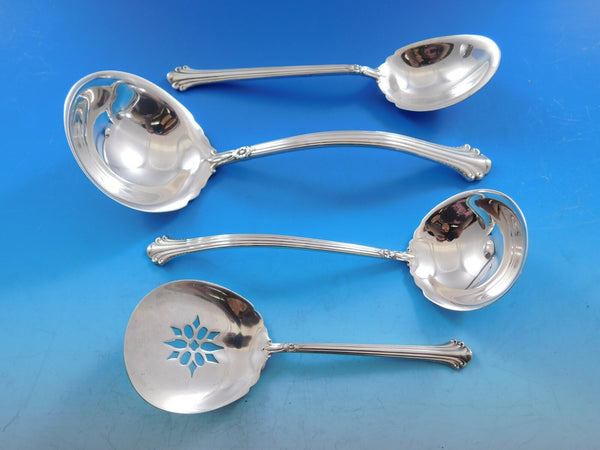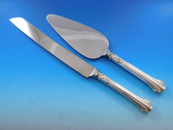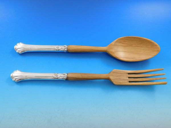 8 Knives, 8 3/4"8 Forks, 7 1/4"8 Salad Forks, 6 3/4"8 Teaspoons, 6 1/8"8 Cream Soup Spoons, 6 5/8"8 Flat Handle Butter Spreaders, 6"8 Cocktail Forks, 5 3/4"8 Iced Tea Spoons, 7 7/8"8 Fish Knives, hollow handle, original, 8"8 Fish Forks, hollow handle, 7 3/4"1 Berry Spoon, 9"1 Wedding Cake Knife, custom made, 12"1 Gravy Ladle, 6 1/2"1 Serving Spoon, 8 1/2"1 Pierced Serving Spoon, 8 1/2"1 Cold Meat Fork, 8 3/4"1 Sugar Spoon, 5 7/8"1 Flat Handle Master Butter, 7"1 Lemon Fork, 5 1/4"1 Sauce Ladle, 5"1 Nut Spoon, 5"1 Baked Potato Fork, custom made, 8"1 Buffet Fork, with stainless, 9 1/2"1 Punch Ladle, with stainless, custom, 13 1/2"1 Salad Serving Set, 2-piece, olive wood, 10 1/2"1 Cake Server, stainless blade, 9 1/2"Includes bonus brand new storage chest - styles vary.