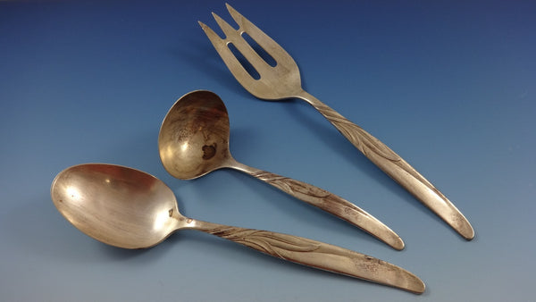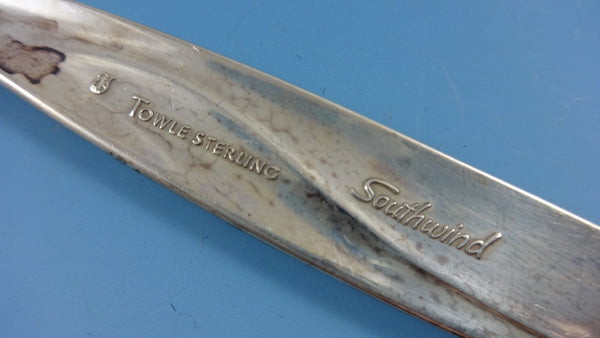 SOUTHWIND BY TOWLE sterling silver Flatware set - 85 pieces. This set includes:12 KNIVES, 8 7/8" 12 FORKS, 7 1/2" 12 SALAD FORKS, 6 5/8" 12 TEASPOONS, 5 7/8" 12 PLACE SOUP SPOONS, 7" 12 HOLLOW HANDLE BUTTER SPREADERS, 6 1/8" 1 GRAVY LADLE, 6 3/8" 3 SERVING SPOONS, 8 3/4" 1 COLD MEAT FORK, 9 3/8" 1 SUGAR SPOON, 6" 1 PICKLE FORK, 6 3/8" 1 CHEESE SERVER W/STAINLESS BLADE, 7" 1 STEAK CARVING SET, 2-PC, KN-10 1/2", FORK-9" 1 ROAST CARVING SET, 2-PC, KN-13 1/2", FORK-11 3/4" 1 WEDDING CAKE/BREAD KNIFE, 16" Includes bonus brand new storage chest - styles vary.