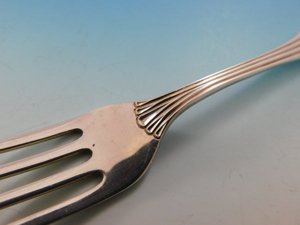 Reminiscent of ocean waves, Caribbean by Wallace sterling silver Flatware set, 70 pieces. This set includes:8 Knives, 9" 8 Forks, 7 1/2" 8 Salad Forks, 6 3/8" 8 Teaspoons, 6" 8 Place Soup Spoons, 6 7/8" 8 Hollow Handle Butter Spreaders, 6 5/8" 8 Cocktail Forks, 6 1/2" 8 Iced Tea Spoons, 7 1/4" 1 Gravy Ladle, 6 1/2" 1 Cold Meat Fork, 8 1/2" 1 Sugar Spoon, 6" 1 Hollow Handle Master Butter, 7" 1 Pickle Fork, 5 1/2" 1 Pie Server w/stainless blade, 11"