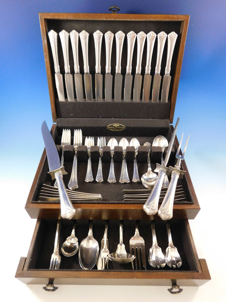 Superb Dinner size Arts Crafts Carmel by Wallace sterling silver flatware set with stylized bolts and hammered border - 108 pieces. This set