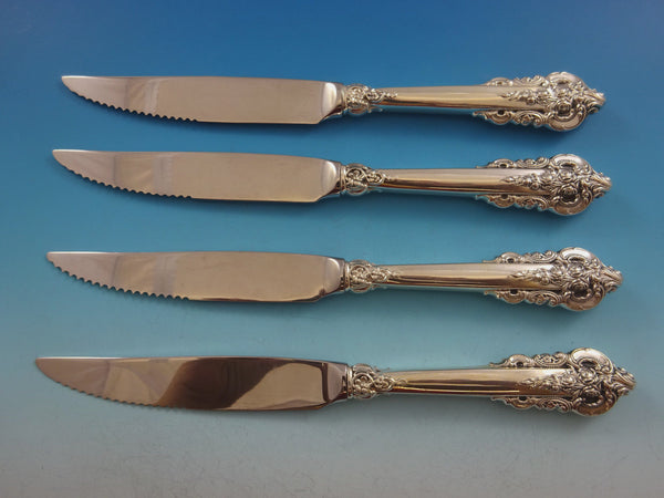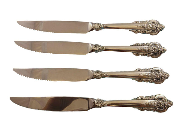 Best seller! Sterling silver hollow handle with stainless serrated blade 4-piece Steak Knife Set Custom made 9 1/4" in the pattern GRANDE BAROQUE BY WALLACE. It is not monogrammed and is in excellent condition.