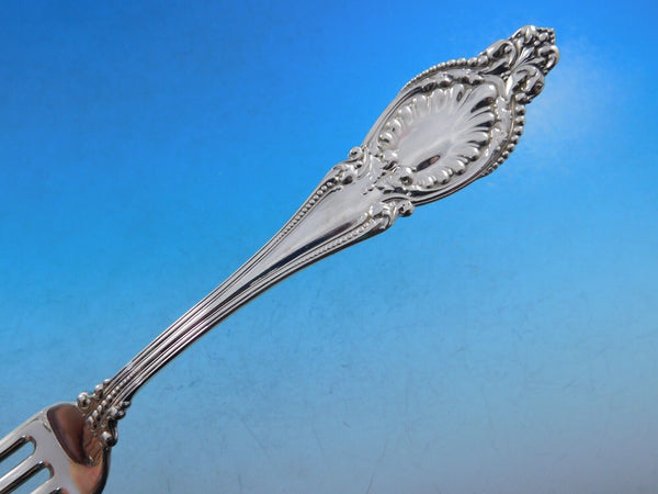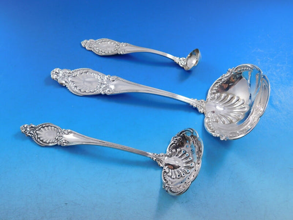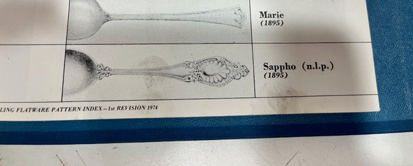Exceedingly rare Dinner Luncheon Size Sappho by Wallace, circa 1895, sterling silver Flatware set, 78 pieces. This is the only set we have ever seen in this pattern! In the Jewelers keystone sterling flatware identification book it lists this as a not full line pattern - that means it was unknown that a full setting existed! This set includes: