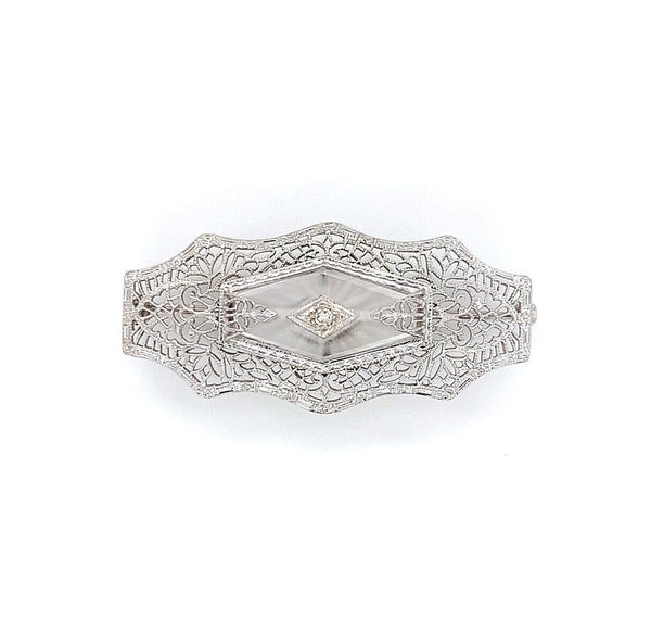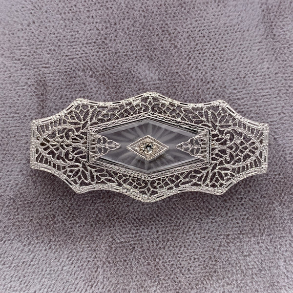 Art Deco 10k white gold pin featuring a beautiful frosted and reverse carved rock crystal quartz panel. The crystal is accented with a small round diamond set in the center. The pin measures about 1 5/8" by 3/4". The diamond measures about 2mm. It weighs 2.56 dwt., and dates from the 1920s. Lovely!