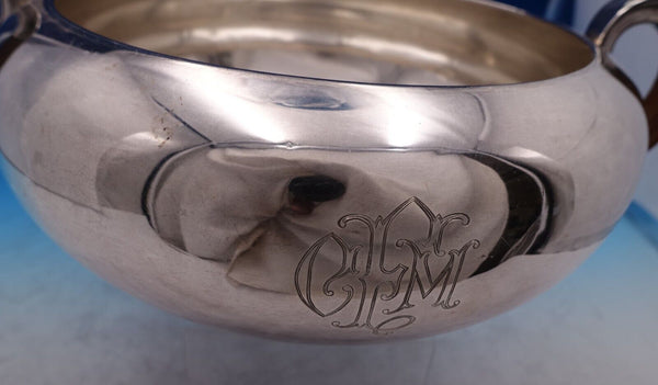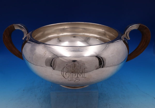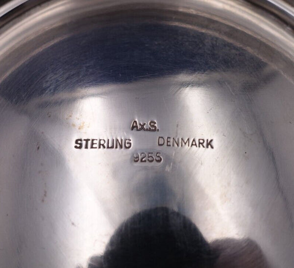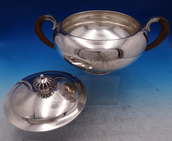 Gorgeous Axel Salomonsen Danish .925 silver tureen made in Copenhagen in the 1950s-1960s. This tureen features a cover, wood handles, and 3-D rings and ball finial. It measures 9" tall x 14" (with handles) and weighs 48.74 troy ounces. It is monogrammed (see photos), and is in good estate condition. Amazing!