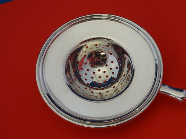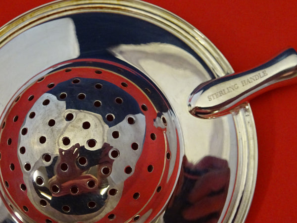 Sterling Silver hollow handle with silverplated implement Over the cup Tea Strainer custom made,in the pattern Royal Danish by International. It measures 7 1/2" in length with a bowl diameter of 3 1/2". It is not monogrammed and is in excellent condition.