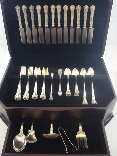 CHANTILLY BY GORHAM sterling silver Flatware set - 90 Pieces. This set includes:12 KNIVES, 8 3/4" 12 FORKS, 7" 12 SALAD FORKS, 6 3/8" 12 TEASPOONS, 5 3/4" 12 FLAT HANDLE BUTTER SPREADERS, 5 7/8" 12 COCKTAIL FORKS, 5 1/2" 12 ICED TEA SPOON, 7 1/2" 1 GRAVY LADLE, 6 7/8" 2 SERVING SPOONS, 8 3/8" 1 COLD MEAT FORK, 8" 1 SUGAR SPOON, 6" 1 SUGAR TONG, 4 1/4" Includes bonus brand new storage chest - styles vary.