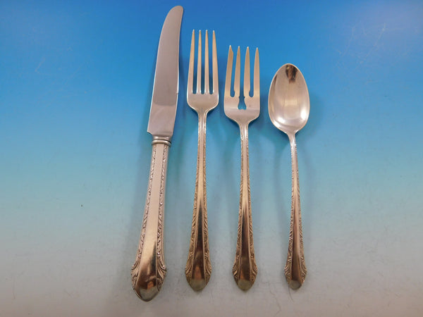Chased Romantique by Alvin sterling silver Flatware set, 55 pieces. This set includes:8 Knives, 9" 8 Forks, 7 1/8" 8 Salad Forks, 6 1/2" 8 Teaspoons, 6" 8 Cream Soup Spoons, 6 1/4" 8 Flat Handle Butter Spreaders, 5 1/2" 1 Gravy Ladle, 6" 1 Serving Spoon, 8 3/8" 1 Small Cold Meat Fork, 7" 1 Sugar Spoon, 6" 1 Flat Handle Master Butter, 7" 1 Lemon Fork, 4 7/8" 1 Cake Server w/stainless blade, 9 3/4" Includes bonus brand new storage chest - styles vary.