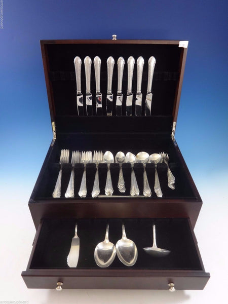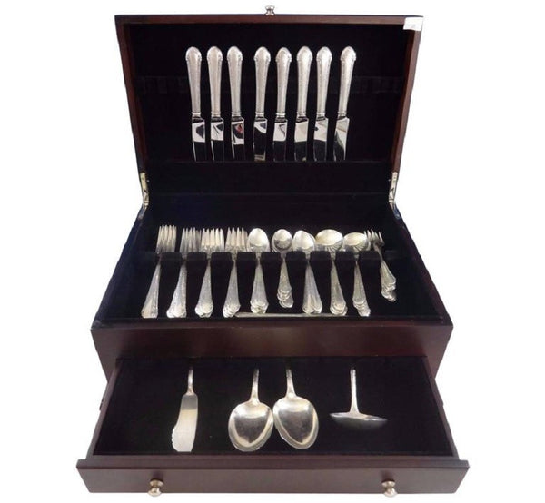 CHASED ROMANTIQUE BY ALVIN sterling silver Flatware set - 68 Pieces. This set includes:8 KNIVES, 9" 8 FORKS, 7 1/8" 8 SALAD FORKS, 6 1/2" 16 TEASPOONS, 6" 8 CREAM SOUP SPOONS, 6 1/4" 8 FLAT HANDLE BUTTER SPREADERS, 5 1/2" 8 COCKTAIL FORKS, 5 3/8" 1 GRAVY LADLE, 6" 2 SERVING SPOONS, 8 3/8" 1 FLAT HANDLE MASTER BUTTER KNIFE, 7"