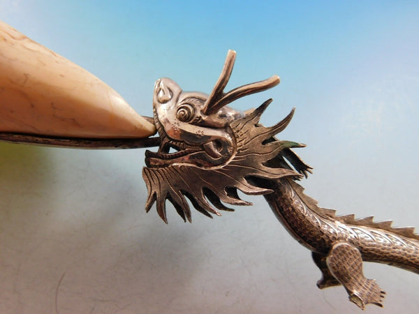 Extraordinary Chinese sterling silver serving spoon measuring 13 1/2". This intricately made piece has a realistic dragon handle with amazing detail including individual scales and spikes. It is not marked, not monogrammed and is in excellent condition.