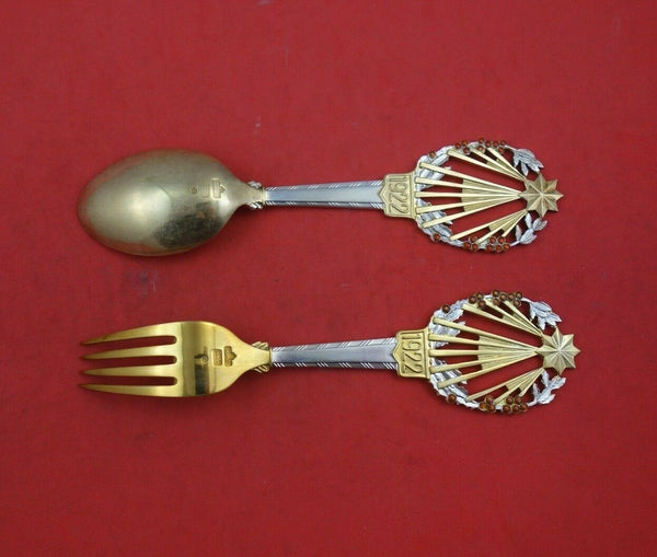Sterling silver Fork and Spoon Set 2-Piece 1922 "Holly" 6 1/2" in the pattern Christmas by A. Michelsen. This set is vermeil (completely gold washed) and was designed by Bertha Dorph. It is not monogrammed and is in excellent condition.