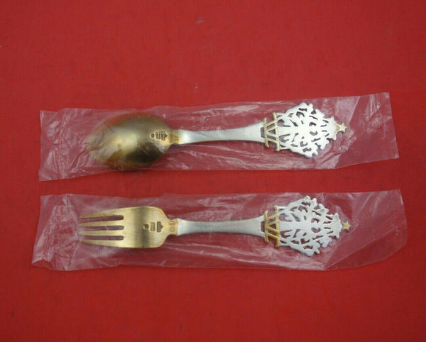 Sterling silver Fork and Spoon Set 2-Piece 1932 "Children Around the Christmas Tree" 6 1/2" in the pattern Christmas by A. Michelsen. This set is vermeil (completely gold washed) and was designed by Ebba Holm. It is not monogrammed and is in excellent condition.