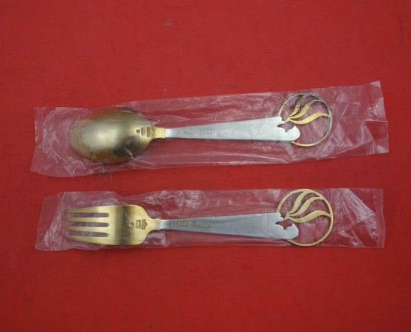 Sterling silver Fork and Spoon Set 2-Piece 1933 "Little Match Girl" 6 1/2" in the pattern Christmas by A. Michelsen. This set is vermeil (completely gold washed) and enameled, and was designed by Lunding. It is not monogrammed and is in excellent condition.