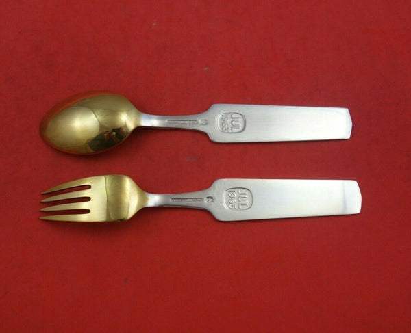 Sterling silver Fork and Spoon Set 2-Piece 1963 "Santa's Village" 6 1/2" in the pattern Christmas by A. Michelsen. This set is vermeil (completely gold washed) and was designed by Carsten Frolich. It is not monogrammed and is in excellent condition.