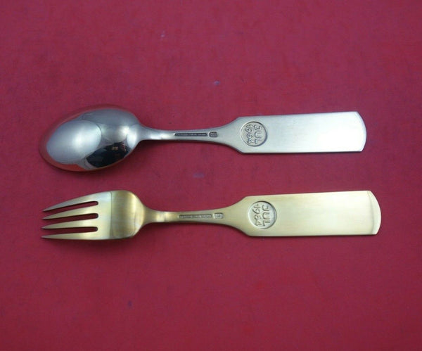 Sterling silver Fork and Spoon Set 2-Piece 1964 "Orion" 6 1/2" in the pattern Christmas by A. Michelsen. This set is vermeil (completely gold washed) and was designed by Inger Hanmann. It is not monogrammed and is in excellent condition.