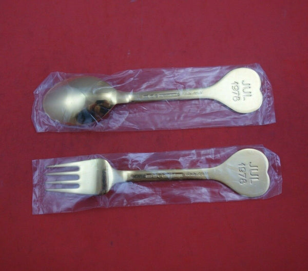 Sterling silver Fork and Spoon Set 2-Piece 1978 "Solstice" 6 1/2" in the pattern Christmas by A. Michelsen. This set is vermeil (completely gold washed) and was designed by Vibeke Alfelt. It is not monogrammed and is in excellent condition.