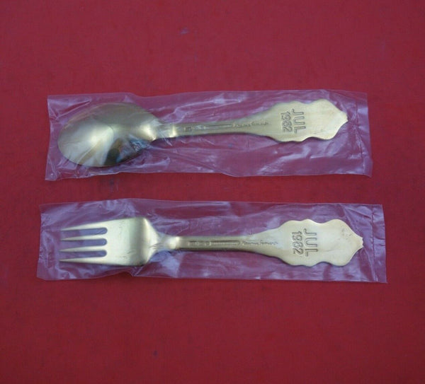 Sterling silver Fork and Spoon Set 2-Piece 1982 "Queen of Sheba" 6 1/2" in the pattern Christmas by A. Michelsen. This set is vermeil (completely gold washed) and was designed by Kamma Sevnsson. It is not monogrammed and is in excellent condition.