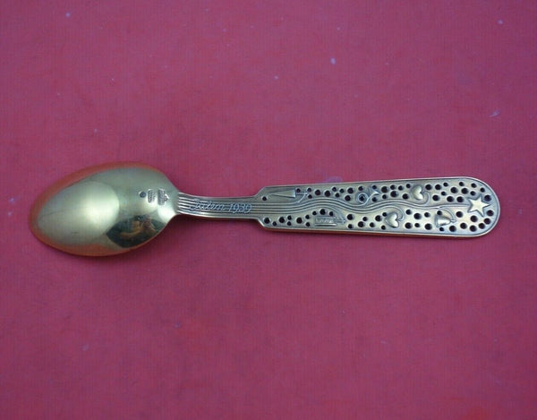 Sterling silver Teaspoon 1939 "Gift Laden Christmas Tree" 6 1/2" in the pattern Christmas Spoon by A. Michelsen. This spoon is vermeil (completely gold washed) and was designed by Olaf Staehr-Nielsen. It is not monogrammed and is in excellent condition.