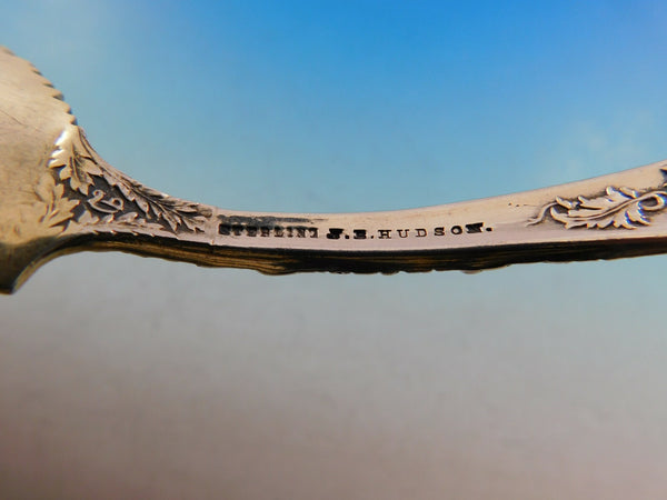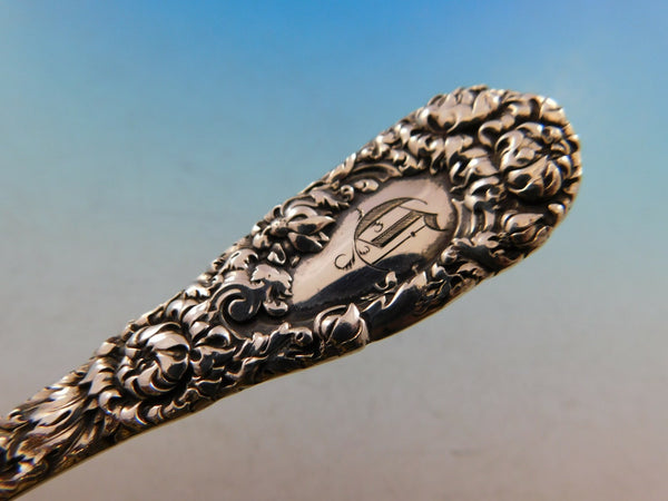 Extraordinary sterling silver Cracker Scoop measuring 8 3/8" in the pattern Chrysanthemum by Durgin. This piece has a lovely floral handle flowing down the handle and into the beautifully gold washed and fancy bowl. It is monogrammed (monos vary) and is in excellent condition.