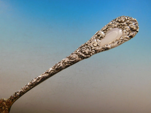 Stunning sterling silver Salad Serving Set measuring 8 3/4" in the pattern Chrysanthemum by Durgin. This piece has a lovely floral handle flowing down the handle flowing into the beautifully gold-washed serving areas. It is monogrammed (although not showing in stock photo; monos vary) and is in excellent condition.