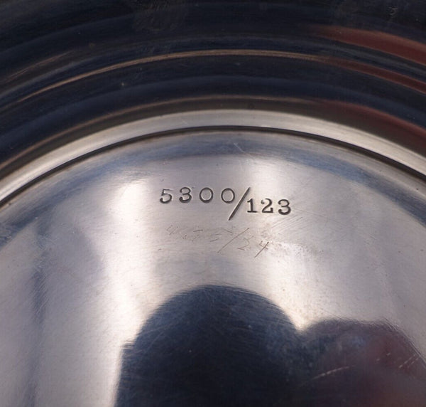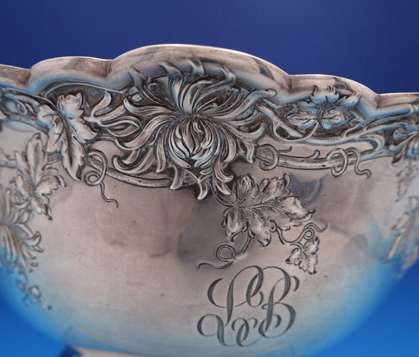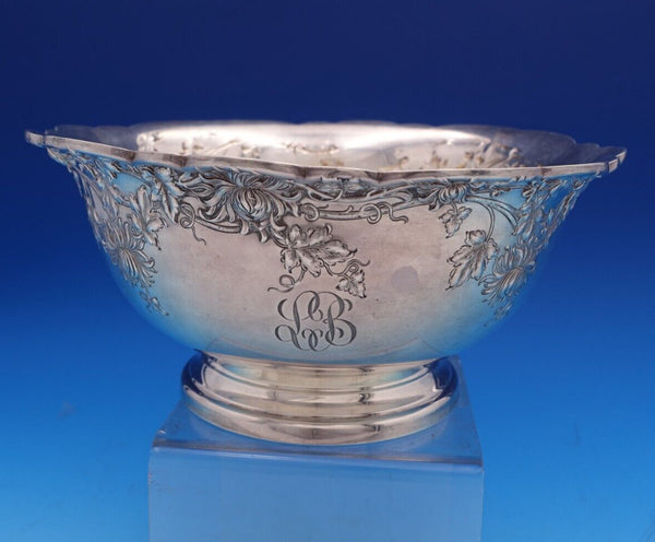 Lovely Chrysanthemum sterling silver fruit bowl marked #5300/123 (maker unknown). This bowl measures 4 5/8" tall x 9 1/4" (actual) and weighs 21.8 troy ounces. It is monogrammed (see photos), and is in good estate condition. Wow!