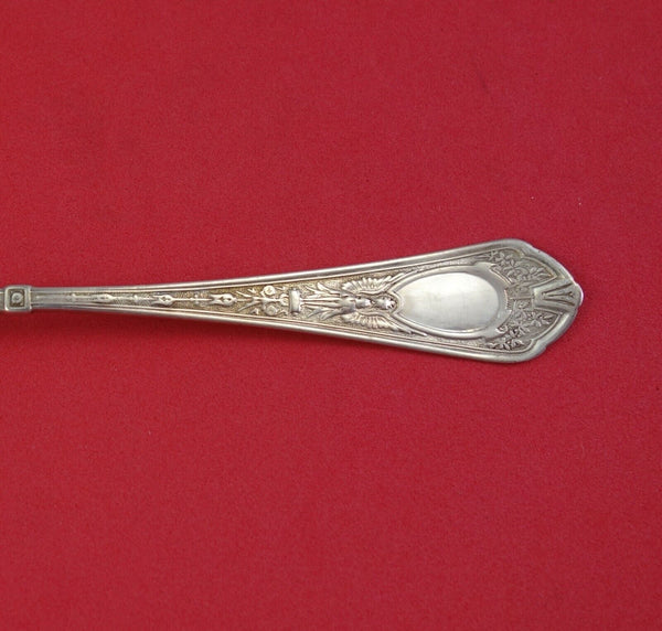 Sterling silver Jelly Spoon with shield shaped bowl, bright cut 6 1/4" in the pattern Cleopatra by Schulz and Fischer. It is not monogrammed and is in excellent condition.